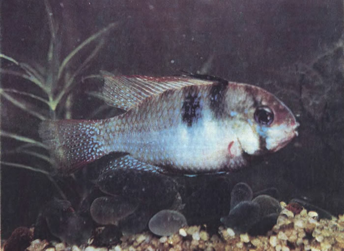 Наиболее известный любителям мелких цихлид. Удлиненное тело рыб золотистожелтого цвета с тремя темными продольными полосками. Самки достигают 8 см в длину, самцы мельче, стройнее. Созревают к 10 месяцам. Нерестятся в укрытиях. Для этого подходят цветочные горшки. Родители ухаживают за потомством. Мальки относительно крупные. Оптимальные условия содержания: жесткость не менее 10°, pH — не ниже 7,4, температура — 25—26°C. Рыбы неуживчивы, в малых емкостях возможны драки со смертельным исходом.