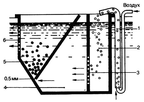 2. Схема устройства для инкубирования икры малавийских цихлид: 1 — эрлифт, подающий воду из аквариума; 2 — капроновая вата; 3 — проточные отверстия; 4 — отсек аэрированной воды; 5 — инкубаторная емкость; 6 — выход воды в аквариум.