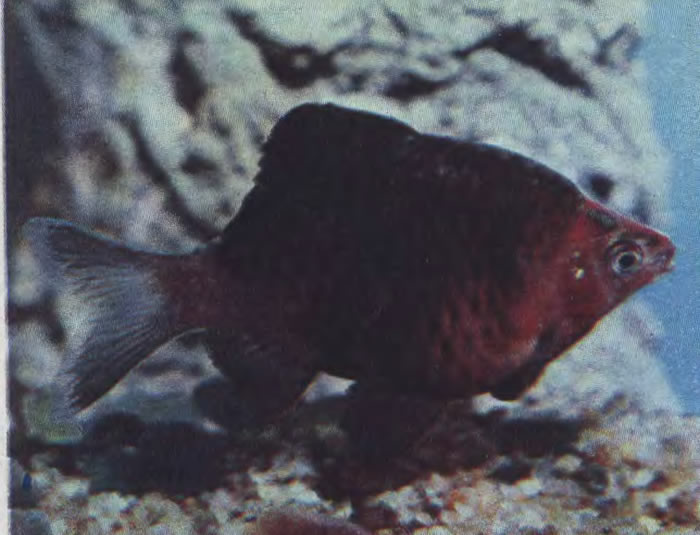 Также происходит из Таиланда. Размерами и строением тела сходен с предыдущим видом. Приятно сочетание изменчивой оливково-зеленой окраски корпуса с ярко-красными плавниками, на хвостовом стебле — темное пятно. Отмечены случаи размножения в общих аквариумах.