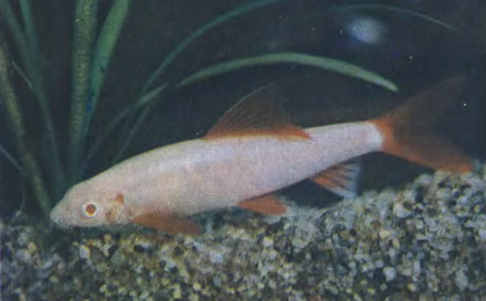 Альбиносная форма зеленого лабео. Общий фон тела розово-белый, плавники и глаза карминного цвета. Альбиносы требуют более комфортных условий содержания, обильного кормления. Нежелательно содержать их с экземплярами исходной формы, так как они будут забивать альбиносов.