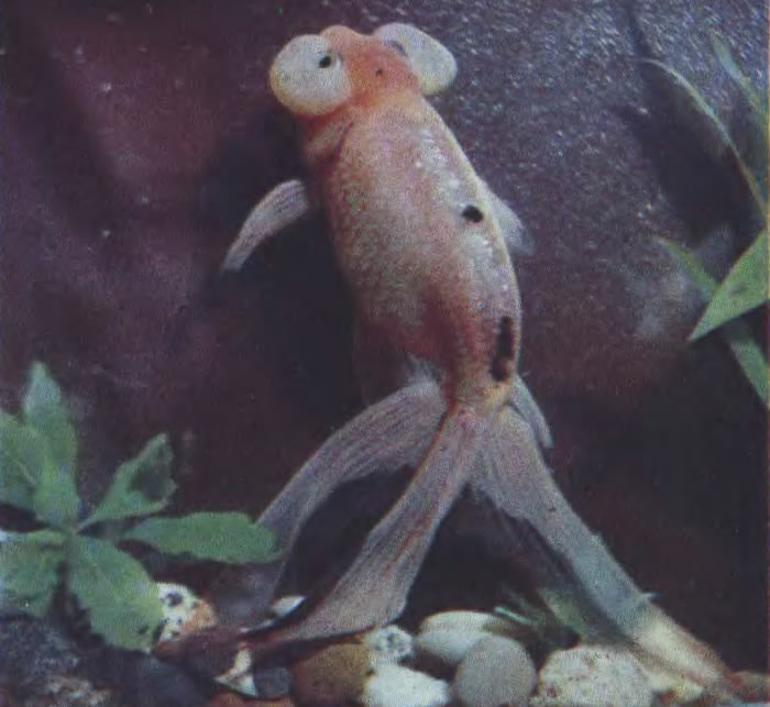 Звездочет (небесное око). Нижняя часть края глазной впадины превращена в пузырь и выворачивает глазное яблоко кверху, поэтому рыба имеет возможность смотреть только вверх. Тело короткое, спинной плавник отсутствует, окраска преимущественно красно-болотистая. Нужно оберегать рыб от повреждения глаз.