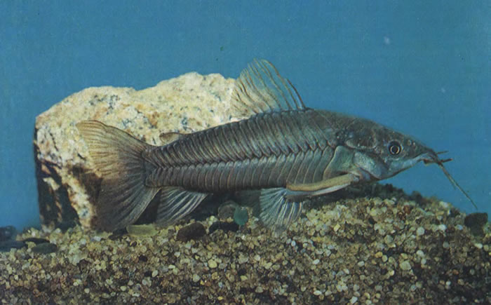 Родина — Бразилия, Тринидад и Гайана. Тело довольно крупное (до 20 см в длину), покрыто двумя рядами костных пластин, на верхней челюсти короткой, сплющенной головы расположены две пары усов.