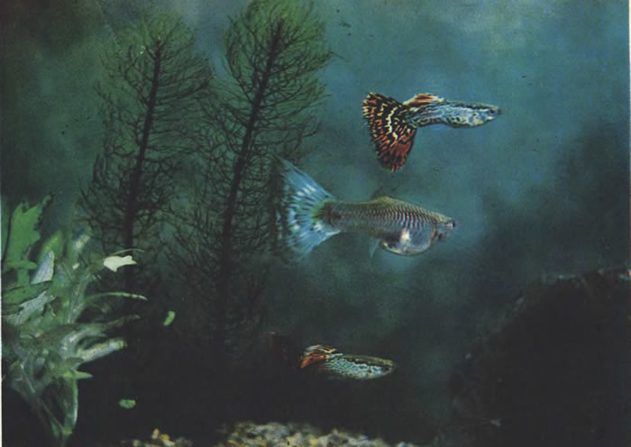 Начинающий аквариумист должен знать, что имеющиеся у любителей гуппи, столь привлекательные своей формой и окраской,— результат упорной селекционной работы, которая начата еще в 1909 г. Это — культурные формы, более прихотливые и требующие комфортных условий. Вода должна быть средней жесткости (7—10°), pH — около 7, температура — 24—27°C, особенно важна ее стабильность. Для группового содержания желательны аквариумы средних размеров. Воду необходимо аэрировать и фильтровать. Аквариум погуще засаживают растениями без жестких режущих кромок листьев, которые могут повредить нежные плавники рыб. Желательно также не класть в аквариум камни и коряги с острыми краями.