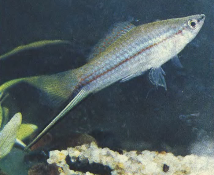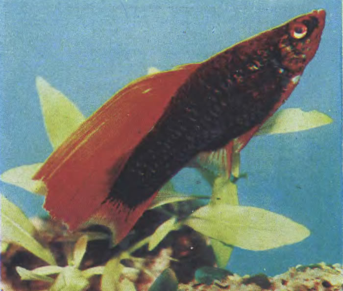 Так называемый исходный вид, в окраске которого имеются зеленый и красный цвета. Меченосец обычно раньше других представителей живородок попадает в аквариум начинающего любителя. Он очень яркий — искусственно выведенные формы имеют красную, пятнистую, черную, ситцевую окраску, различаются по форме плавников. Питание и разведение — как у предыдущего рода.